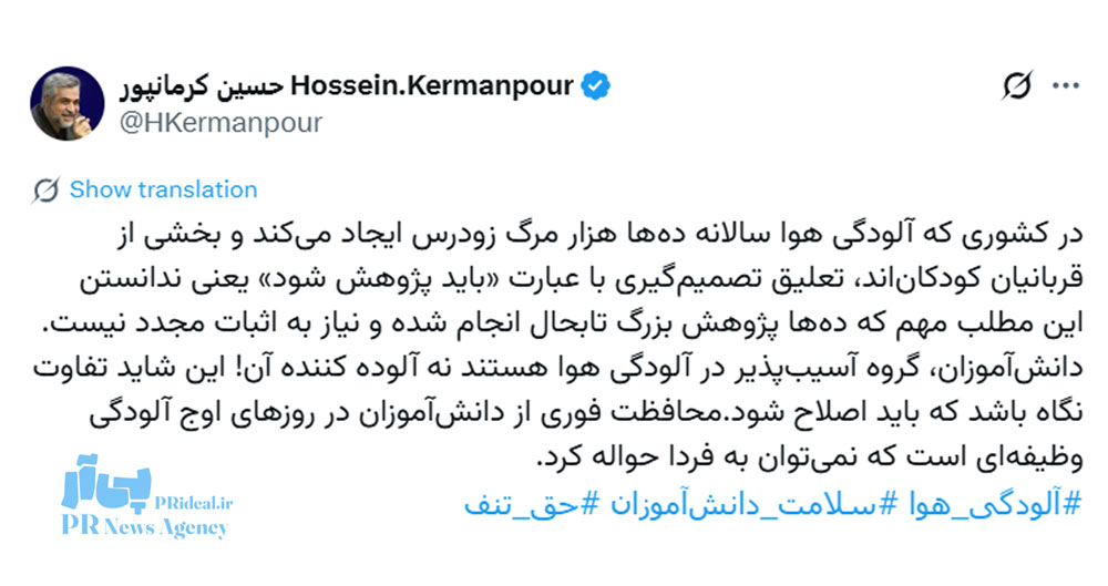 در این پیام آمده است: در کشوری که آلودگی هوا سالانه دهها هزار مرگ زودرس ایجاد میکند و بخشی از قربانیان کودکاناند، تعلیق تصمیمگیری با عبارت «باید پژوهش شود» یعنی ندانستن این مطلب مهم که دهها پژوهش بزرگ تابحال انجام شده و نیاز به اثبات مجدد نیست.
