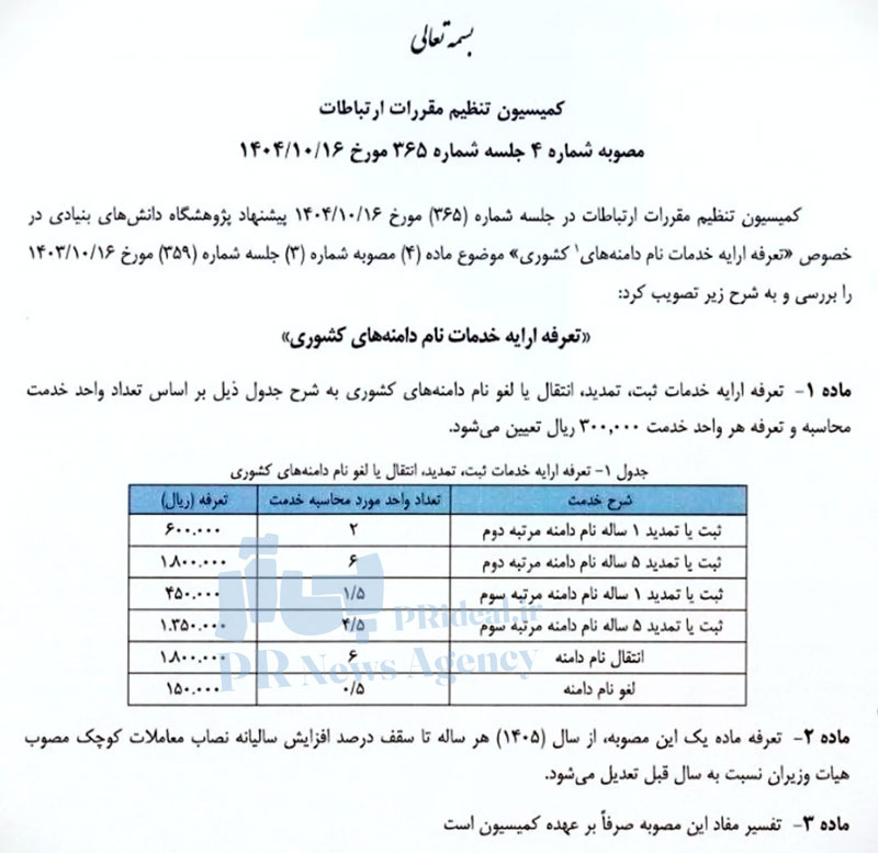 پاسخ روابط عمومی معاونت اجرایی رئیسجمهور به روزنامه جوانبه گزارش آژانس خبری پی آر؛ بر اساس مصوبه کمیسیون تنظیم مقررات، تعرفههای جدید ثبت و خدمات دامنههای کشوری اعلام شد.