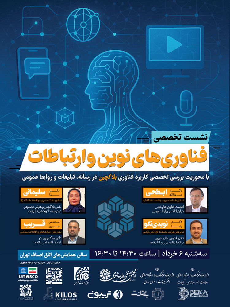 ۳۰ پرامپت هوش مصنوعی برای تحول عملکرد روابط عمومیبه گزارش پی آر؛ نشست تخصصی فناوریهای نوین و ارتباطات با محوریت بررسی تخصصی کاربرد فناوری بلاکچین در رسانه، تبلیغات و روابطعمومی به همت انجمن صنفی روابط عمومی استان تهران روز سهشنبه ۶ خرداد ساعت ۱۴:۳۰ تا ۱۶:۳۰ برگزار می شود.