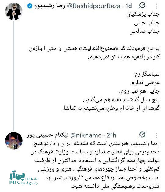 پس از انتشار پیام رضا رشیدپور در شبکه ایکس مبنی بر ممنوعالکاری و خانهنشینی اجباری، نیکنام حسینیپور، مدیر روابطعمومی وزارت فرهنگ و ارشاد اسلامی، با انتشار متنی در حساب کاربری خود به این موضوع واکنش نشان داد.